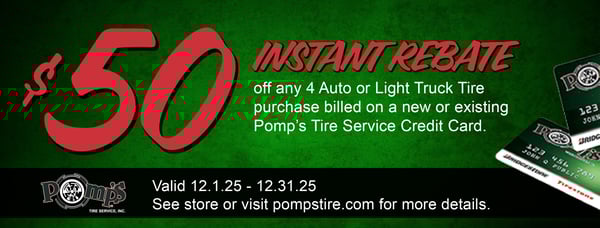 Use your Pomp's Tire Service Credit Card to get an instant $50 rebate on the installation of any four auto or light truck tires—new or existing accounts qualify! Ask an associate for full details.