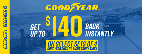 Save $100 instantly when you buy any four Goodyear passenger or light truck tires—no waiting, no mail-in, just instant savings! You can also save $40 instantly when you install any four qualifying Goodyear tires, including WeatherReady, ComfortDrive, and Wrangler models. Ask an associate for full details.