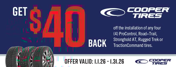 Get $40 off installation when you purchase four select Cooper tires. Use a Goodyear Credit Card to purchase, and get an additional $75 back by mail.