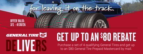 Purchase a set of 4 qualifying General Tires and get up to an $80 General Tire Prepaid Mastercard by mail. See store for details.